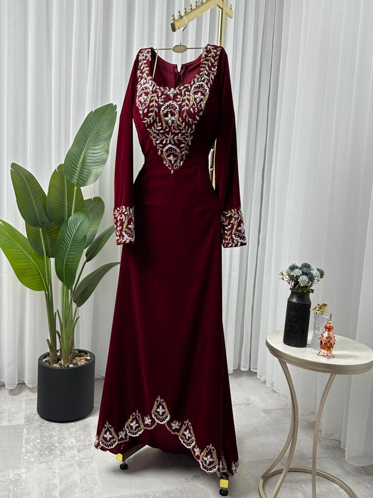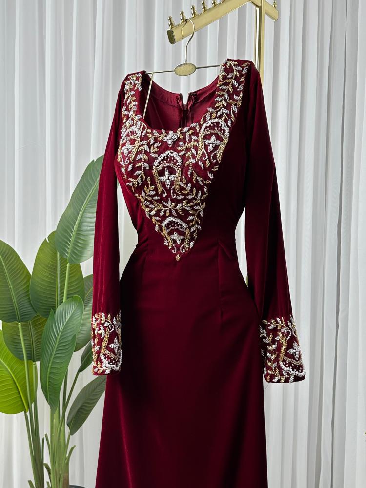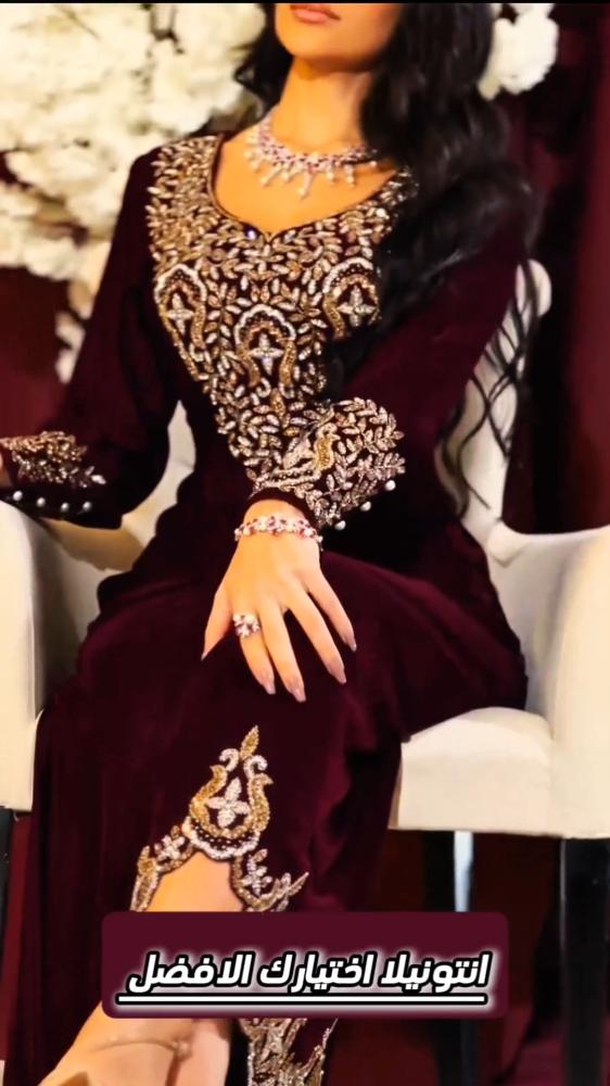 - **اللون:** يتوفر بلون واحد فاخر يعزز من جمالية المخمل والتطريز اليدوي.