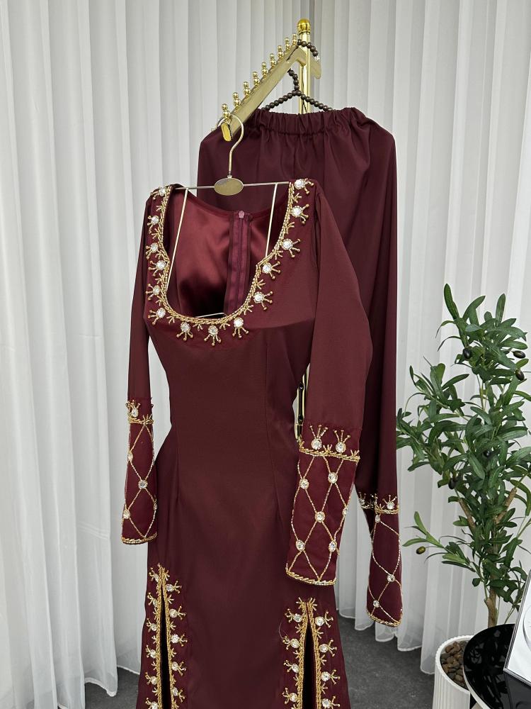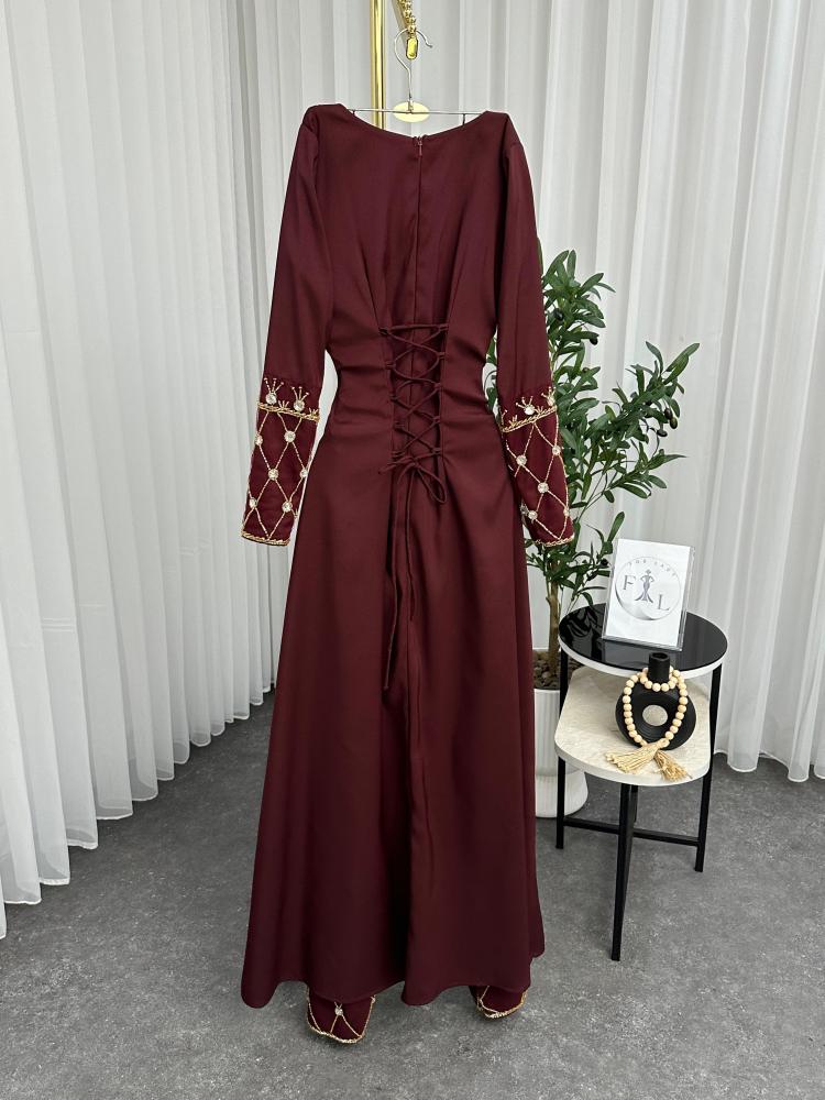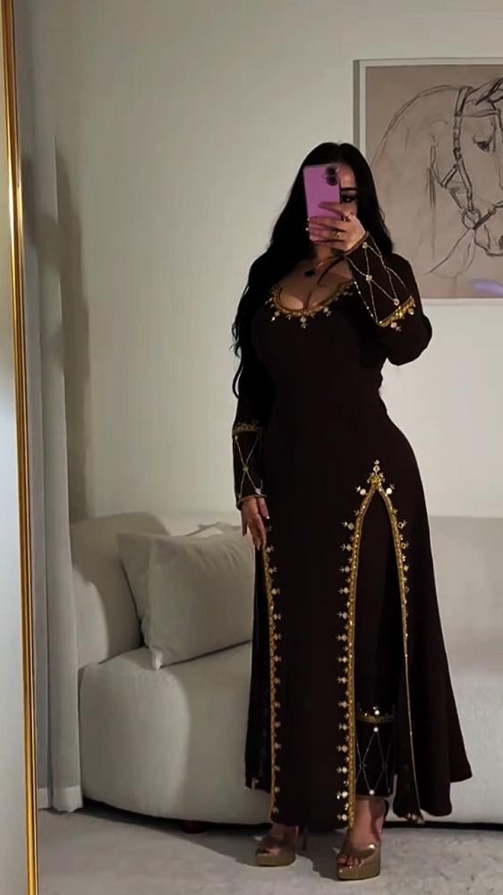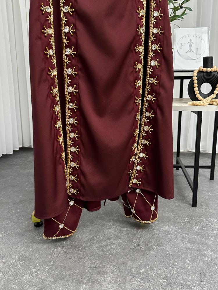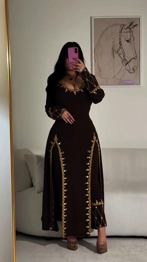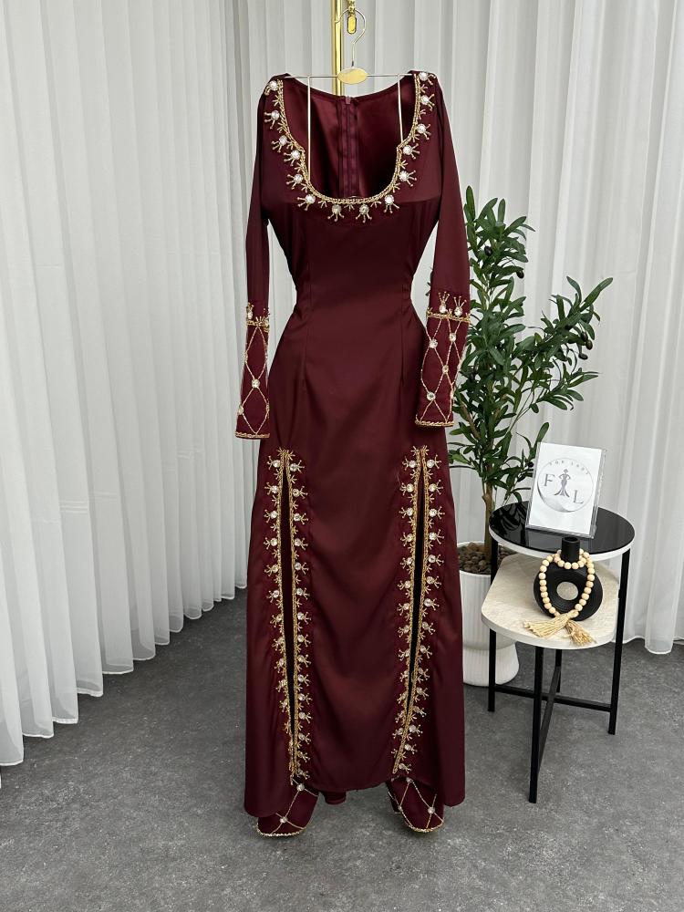 - **الأكمام:** طويلة مزينة بزخارف ذهبية أنيقة مع تفاصيل فريدة.