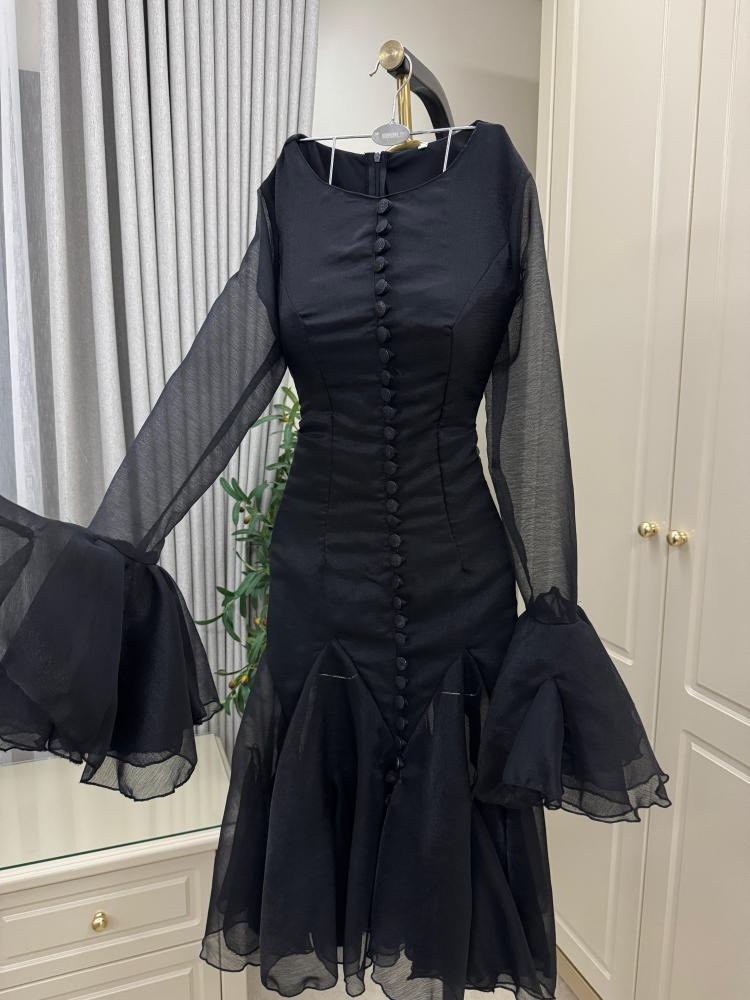 - الأكمام طويلة وشفافة مع قصة واسعة عند المعصم لمظهر راقٍ ومميز.