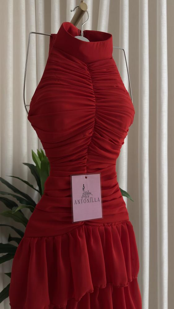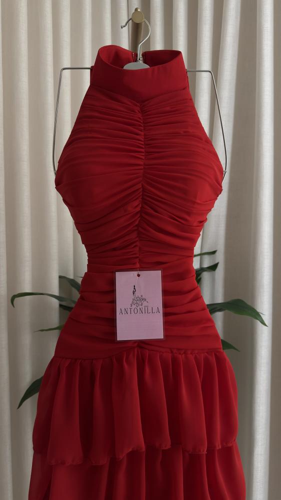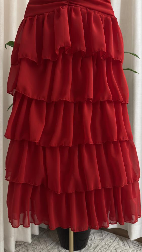 تنورة بطبقات متدرجة بكشكش ناعم تمنح الفستان حركة راقية ورومانسية.